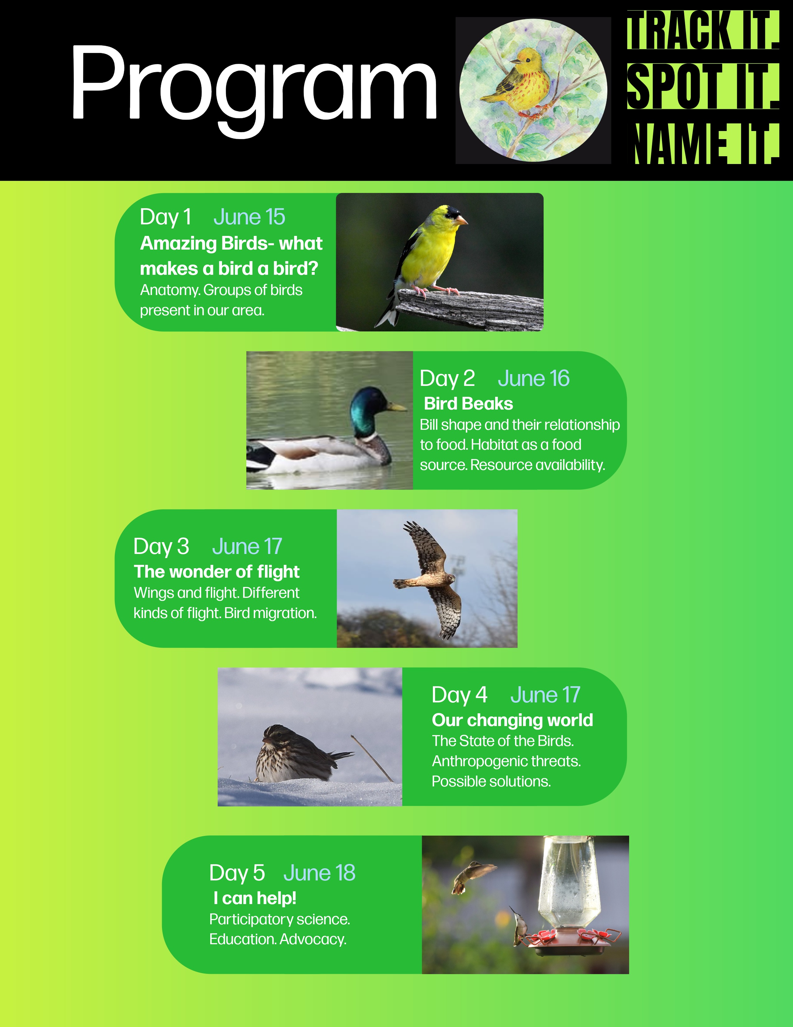 Our science and nature camp will not only be affordable, offering a price that allows low income families to access an educational opportunity, but will also prioritize them for registration. We will collaborate with middle schools’ counseling personnel to reach out to these families, offering them the opportunity to register before opening the camp to the general public. We aim to educate students about the challenges birds face, how they can provide habitat, be advocates in their communities at different levels, and be the next generation leading the change that bird populations need to thrive.